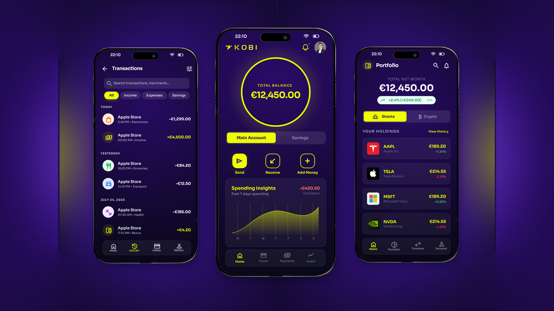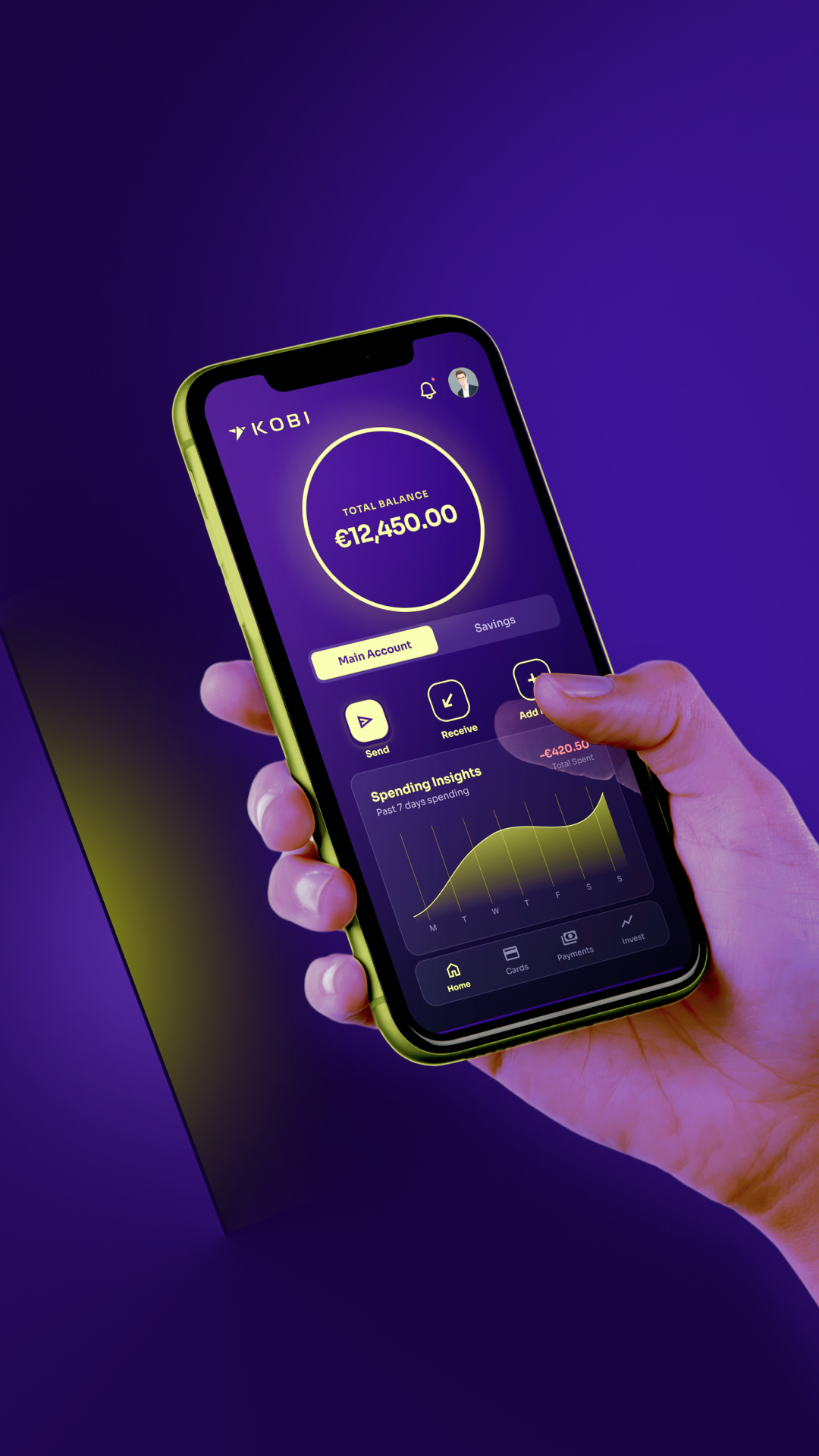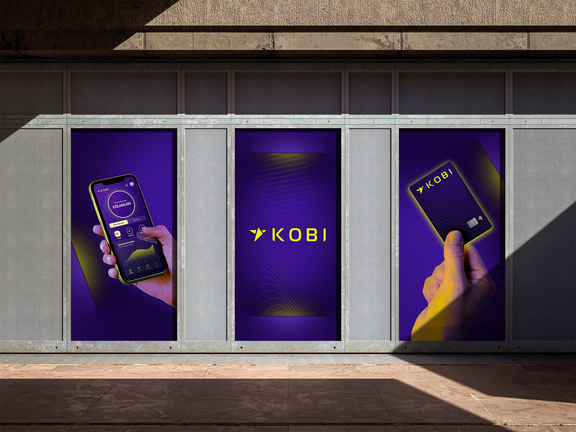 KOBI is an imagined neo bank based in Europe with it’s target audience placed all around the world. It provides banking services without the hassle and complications of classic banking. The target audience are younger generations of any background that wish to access their funds and opportunities using just a few taps on their phone. Inspiration comes from the world of Cyberpunk which I am always drawn to. The main visual theme and campaign is set around “lifting edges”, “funds glow”, and the line pattern generated from the shapes of the logo. The combination of these are meant to represent opportunity and modernity.